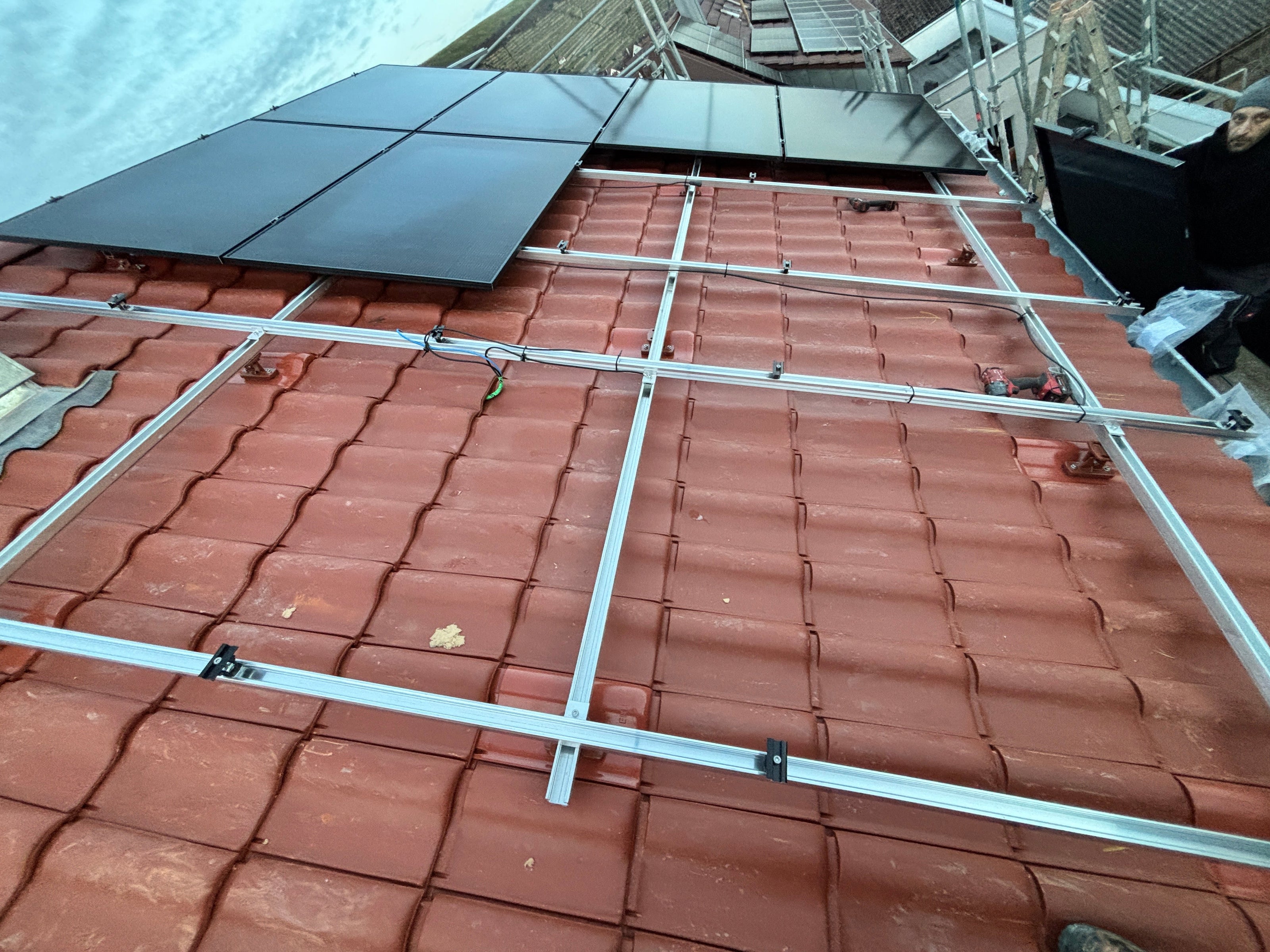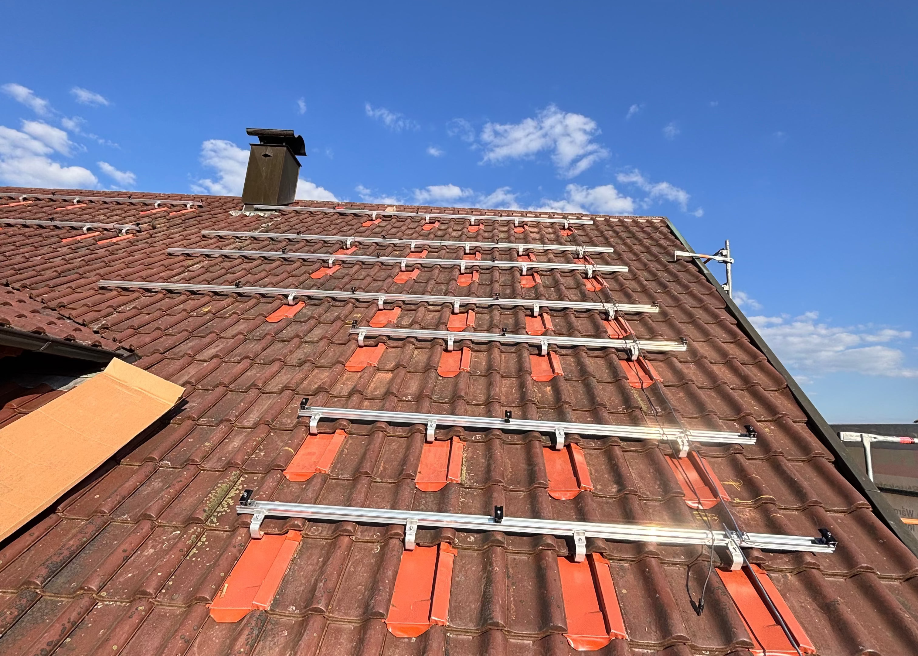 Installation of the substructure for a photovoltaic system. Visible is the secured substructure as well as the replacement of the existing roof tiles at the fastening points with special metallic Lehmann tiles, which ensure a secure and stable installation.
