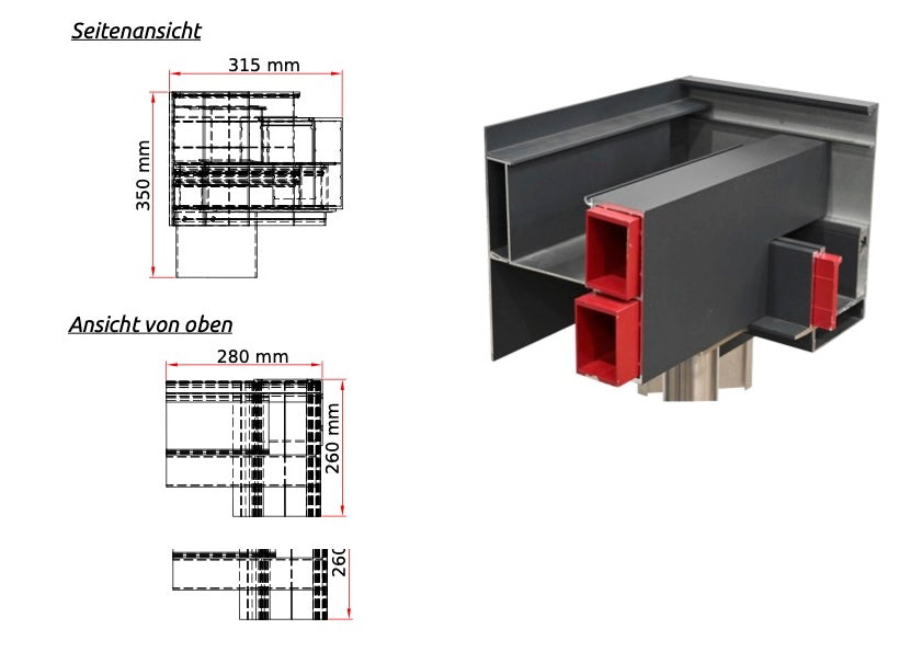 Platzsparend & Effizient. Ideal für komplexe Einbausituationen.Sehen Sie hier, wie kompakt Technik auf kleinstem Raum verbaut werden kann.*Gesamthöhe:350 mm*Ausladung:315 mm*Eck-Dimensionen:280 mm x 260 mm